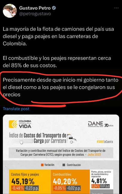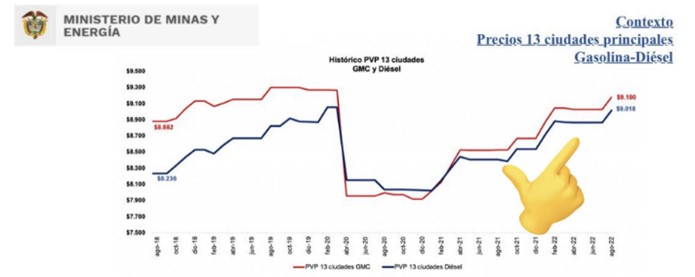 (Cita de María José Pizarro Rodríguez, @PizarroMariaJo, en septiembre 5: “El gob uribista de Iván Duque es el principal responsable de los bloqueos y el problema fiscal por el que atraviesa el país, al congelar el precio del Diésel desde 2020 mientras su costo subía en todo el planeta.