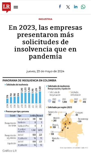 Me preocupa eso si, basado en hechos y datos, que dada la desaceleración de la economía en 2023 y 2024, se han aumentado las empresas en insolvencia (ver datos en la gráfica), aún por encima de similares datos en pandemia y me preocupa más que según el reporte de INFORMA COLOMBIA del primer trimestre de 2024, que si bien se crean empresas es la menor tasa de creación en los últimos 4 años pero MUY PREOCUPANTE que en este año 2024 aumento en un 51% el cierre de empresas.