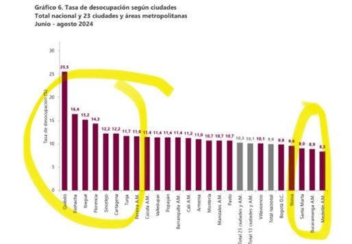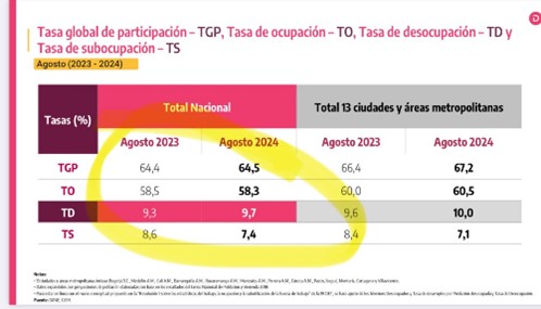 (Cita de BluRadio Colombia, @BluRadioCo, del 30 de septiembre: “#Atención Desempleo en Colombia sube de 9.3 %, en agosto de 2023, a 9.7 % en agosto de 2024 de acuerdo al Dane #VocesySonidos”)