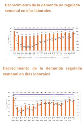 Para mayor claridad, y usando sus propias gráficas: una caída del 30% en los usuarios no regulados en la segunda semana de abril (su primera gráfica), equivale a una reducción del 9% en la demanda total (los no regulados representan el 31.6% de la demanda total). De igual forma, una caída del 10% en los usuarios regulados, su segunda gráfica, implica una caída del 6.8% en la demanda total (los regulados representan el 68.4% de la demanda total).