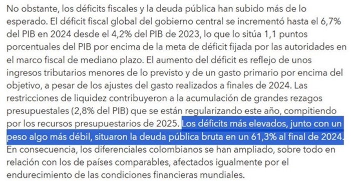 8- En el último comunicado público, el Fondo Monetario Internacional muestra la preocupación sobre el déficit de 6.7% del PIB observado en 2024, que dejó una deuda de 61.3% del PIB.