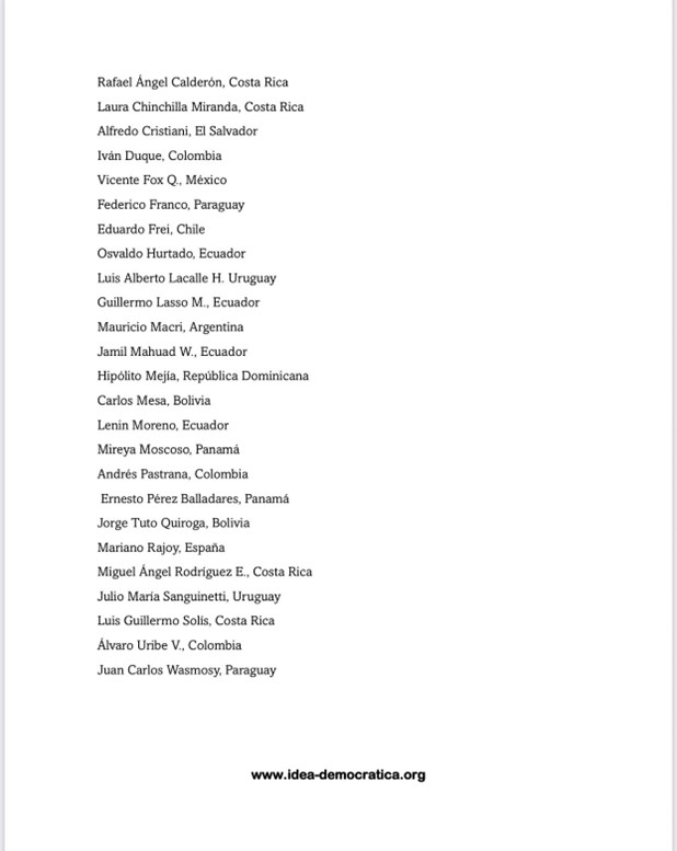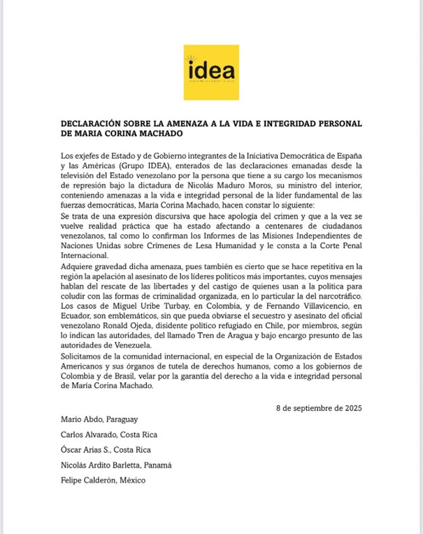 (Cita de Iniciativa Democrática de España Y Las Américas, @IDEA_Grupo, de septiembre 8: “@WhiteHouse @LulaOficial @USAmbOAS @OEA_oficial @petrogustavo 30 Ex jefes de Estado de @IDEA_Grupo piden a la OEA y a gobiernos de Brasil y Colombia velar por la vida e integridad personal de @MariaCorinaYA