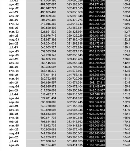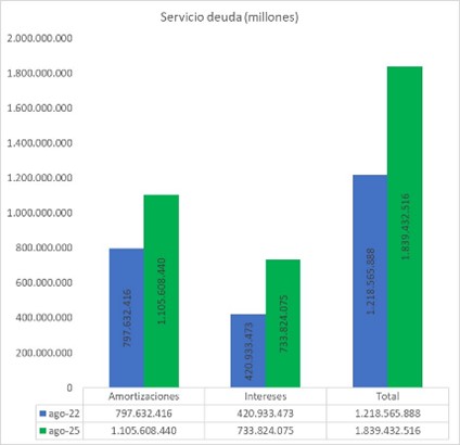 MENTIRA 1. ¡¡Como el cuadro 1 lo demuestra, la deuda externa SI AUMENTA!! De 315 billones en julio de 2022 a 351 billones en julio de 2025. ¡¡Pero lo MÁS GRAVE!! ¡¡¡¡¡Es que la deuda total (interna más externa) usted la aumenta en 300 billones!!!!! Y el servicio a la deuda proyectado en otros 300 billones (ver gráfica 2). O sea que usted ha aumentado la deuda y sus obligaciones proyectadas en 600 billones de pesos.